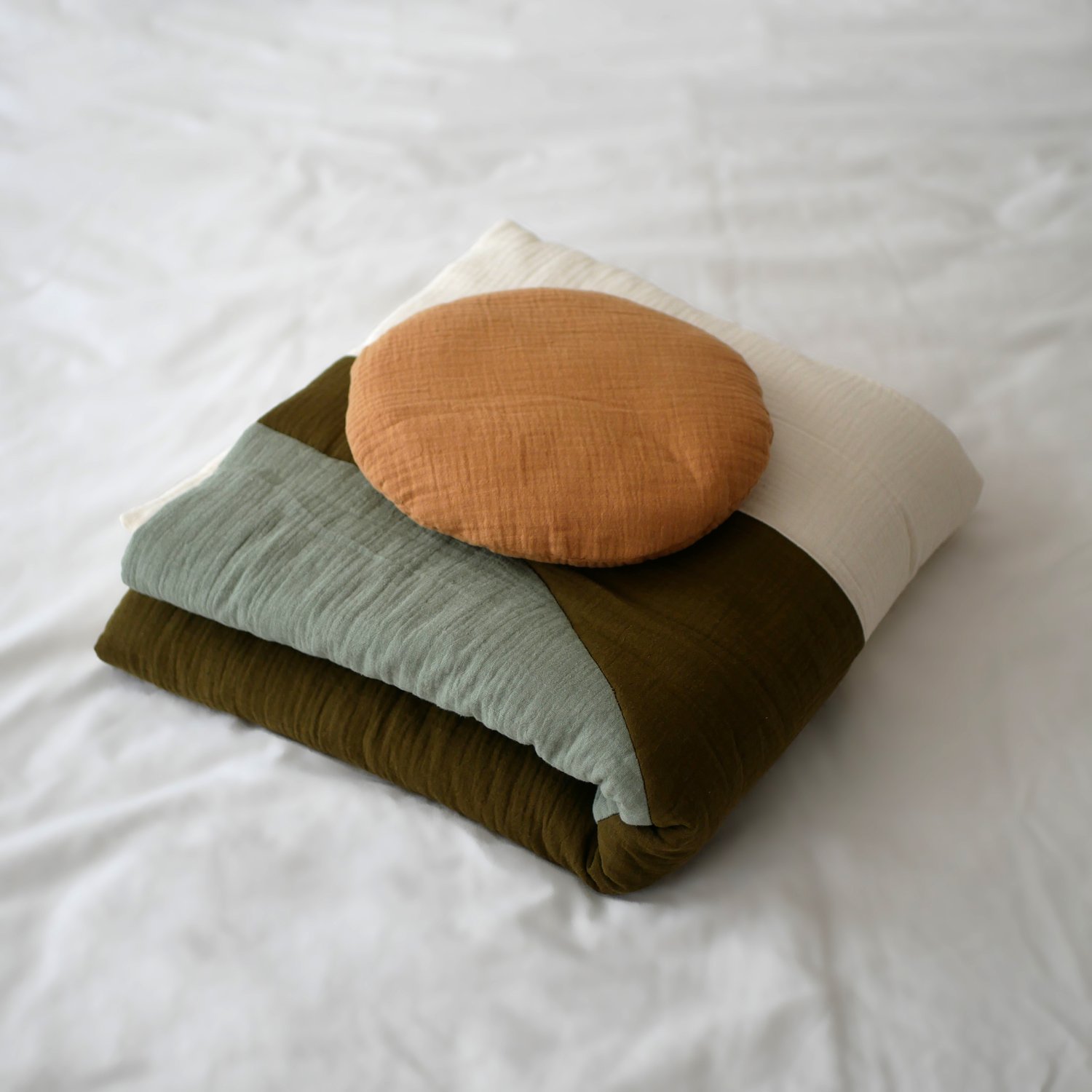 It is made of double cotton gauze certified OEKO-TEX® Standard 100 and is machine washable at 30°C.