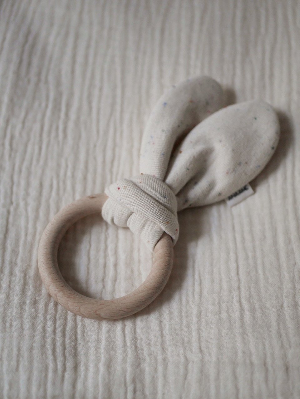 Coffret contenant une paire de chaussons, un anneau de dentition, et un bonnet personnalisé au nom du bébé. Entièrement confectionnés à la main, à Paris, par la créatrice.